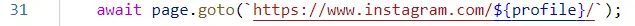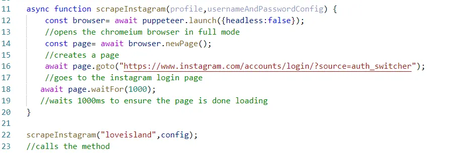 - Create async function and allow the 2 parameters, the profile username of the account you want to scrape and the usernameAndPassword config object.