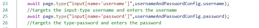 - We firstly, target the css, input[name=”username”]. This targets the username input box, and instructs it to type the username from the config object.