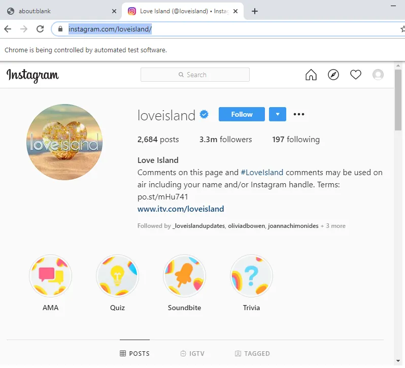 If we run the code, we should be logged in, and on the Love Island Instagram page.