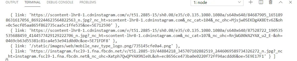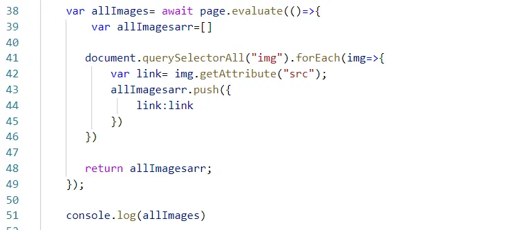 I then on line 51 console.log out the allImages variable to reveal a full array of image links.